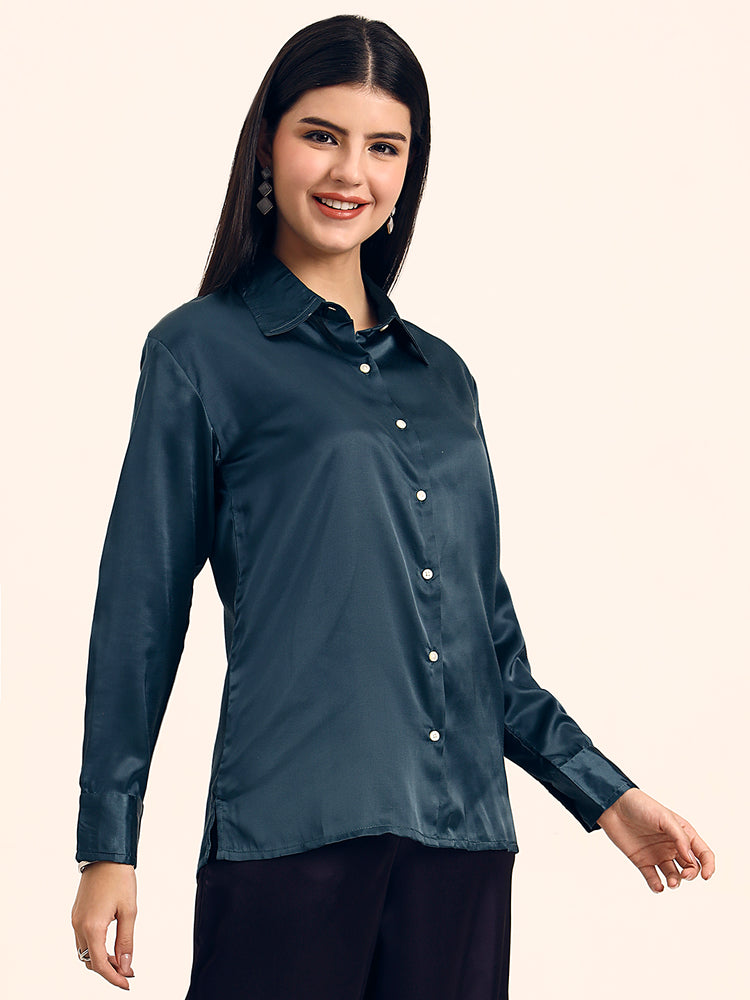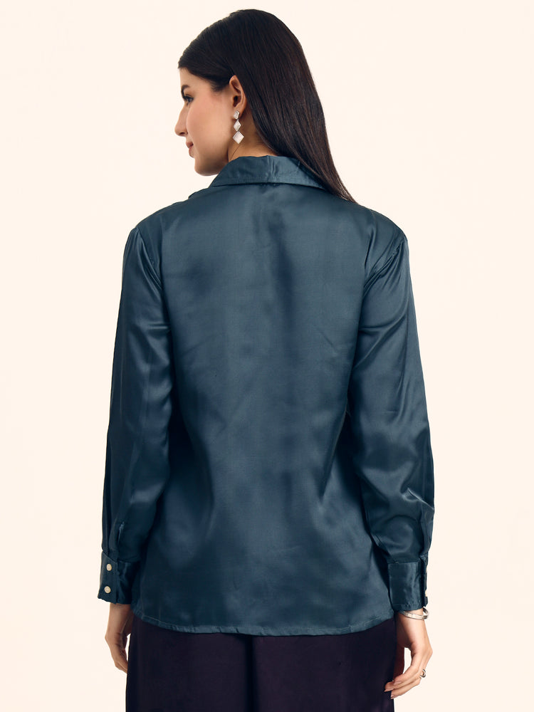 Upgrade your wardrobe with this elegant Deep Teal Modal Satin Shirt – a perfect fusion of sophistication and comfort. Made from premium Modal Satin fabric, it offers a silky-smooth texture with a subtle sheen, giving you a refined and graceful look.
