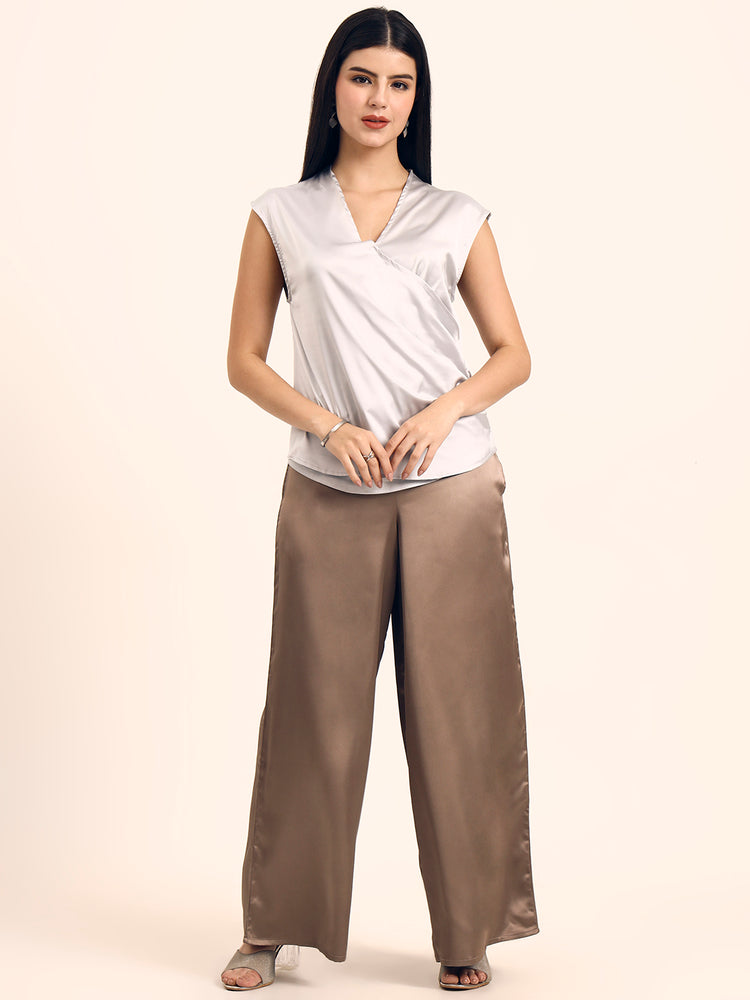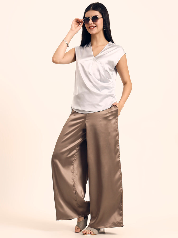 Luxury Satin Wide Leg Pants European Fabric Mocha Pearl Glam Look