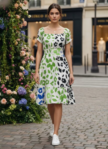 Rayon Printed Puff Sleeve A Line Shirt Dress