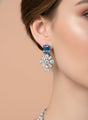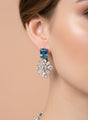 The statement necklace features alternating blue CZ stones and floral white CZ clusters for maximum sparkle, while the matching stud drop earrings add graceful movement. Crafted with high-quality silver plating, this set offers a luxurious high-end look at an affordable price.