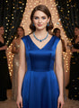 The necklace sits gracefully on the neckline with a combination of blue and white CZ stones for maximum brilliance. The matching teardrop drop earrings complete the look with graceful movement and extra sparkle. Crafted with high-quality silver plating, this set offers a luxurious high-end appearance.