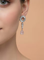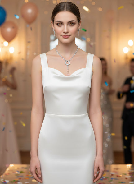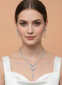 The lariat-style necklace sits beautifully on the neckline, while the matching long drop earrings with pink CZ accents add movement and extra brilliance. Crafted with high-quality silver plating, this set delivers a sophisticated, high-end look at an affordable price.