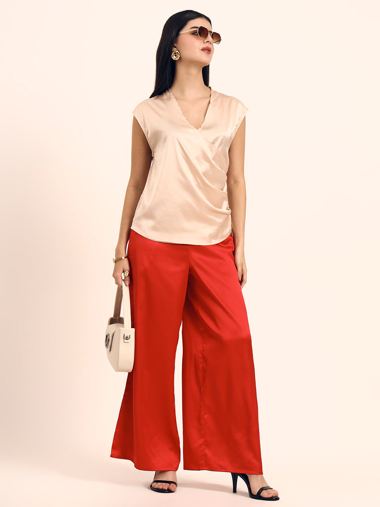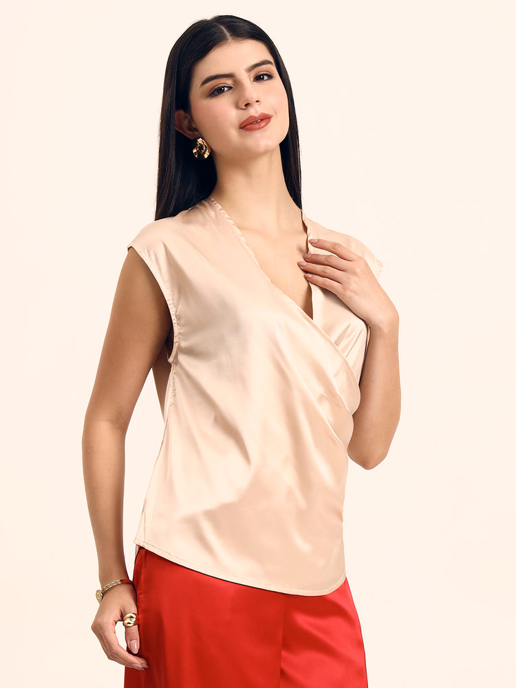 Elevate your everyday style with this elegant satin wrap top. Crafted from luxury satin fabric, it offers a luxurious sheen and a smooth, soft touch against the skin. The chic wrap-style design with a deep V-neckline adds a flattering silhouette, while the cap sleeves give it a modern and versatile appeal. Perfect for both office wear and evening outings, this top pairs effortlessly with trousers, skirts, or jeans for a sophisticated look.