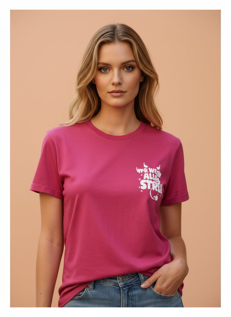 Brighten up your casual wardrobe with this vibrant hot pink graphic t-shirt. Featuring a stylish white “We Are All Stars” chest print with star graphics, this tee gives a perfect blend of positivity, attitude, and trendy street style.