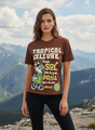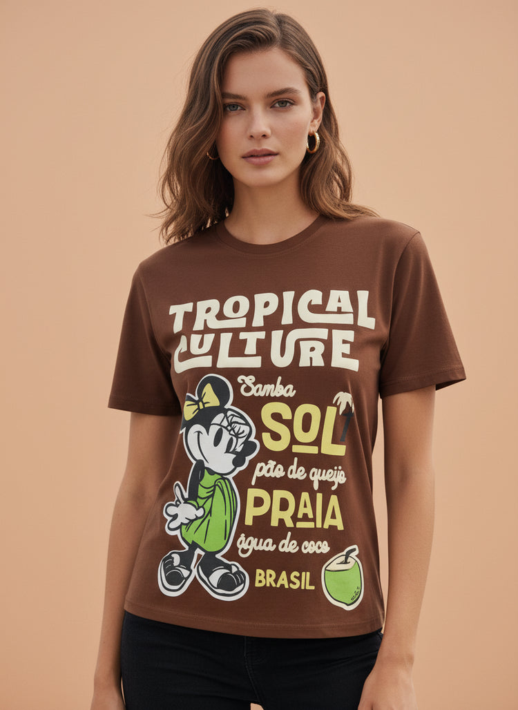 Bring tropical summer vibes to your style with this rich Chocolate Brown Minnie Mouse T-Shirt! Featuring a fun Brazilian carnival theme with "Tropical Culture", Samba, Sol, Praia, and Coconut graphics along with adorable Minnie Mouse in her green outfit.