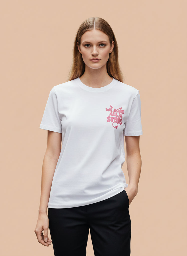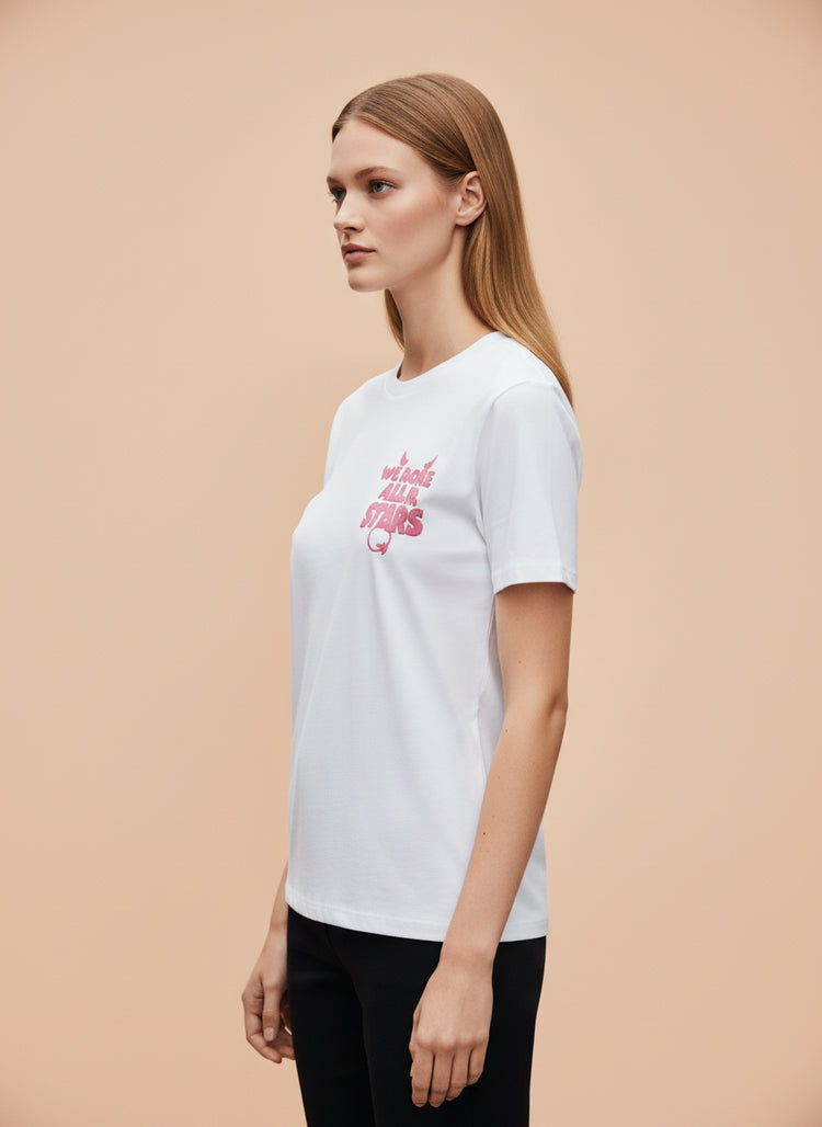 Shine in style with this clean and trendy White Graphic T-Shirt featuring the bold pink quote "We More All The Stars" with cute moon, stars & sparkle design.