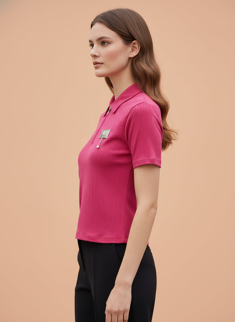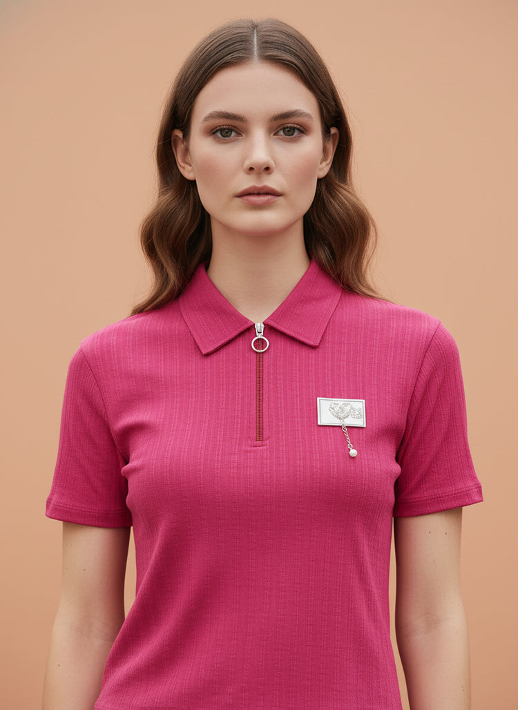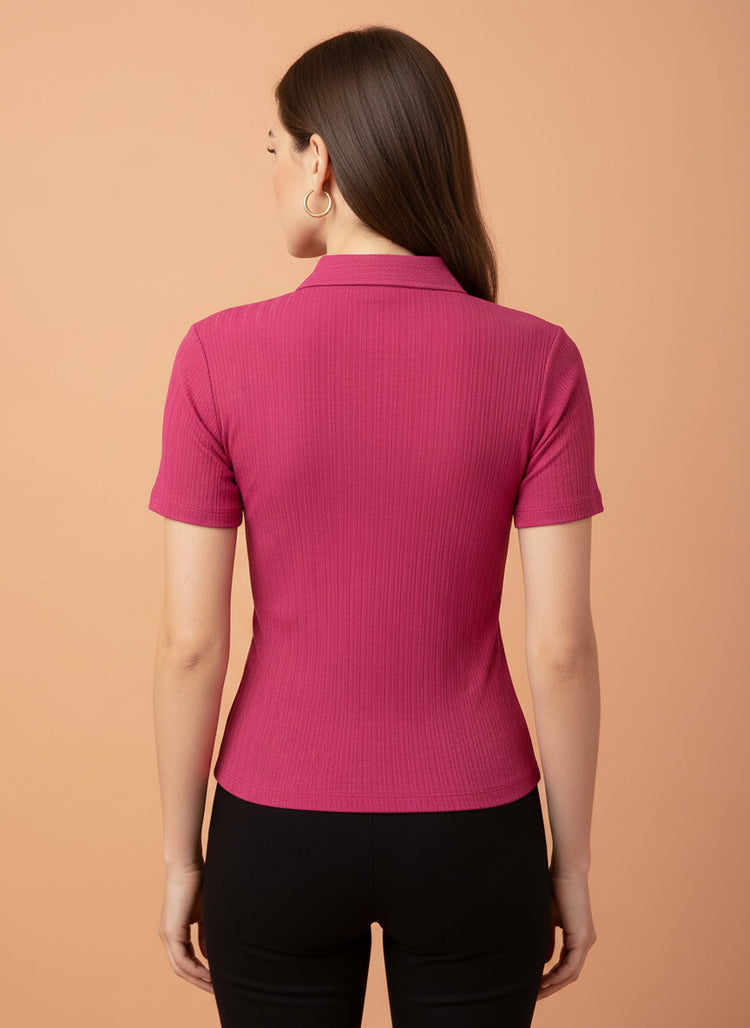 Bold, vibrant aur super stylish – yeh Hot Pink Zip-Up Ribbed Polo Top aapke wardrobe mein ek energetic aur confident statement piece hai.
