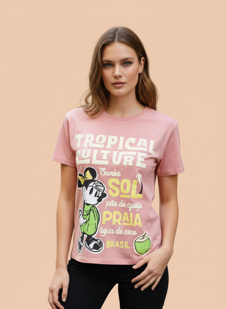 Bring summer energy to your wardrobe with this super cute Pink Minnie Mouse T-Shirt! Featuring a fun Brazilian tropical theme with "Tropical Culture", Samba, Sol, Praia, and Coconut vibes along with adorable Minnie Mouse graphic.