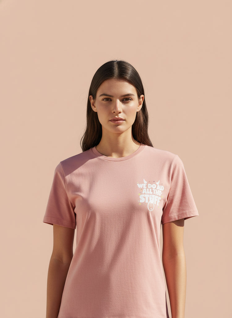 Rock a fun and confident look with this soft Baby Pink Graphic T-Shirt featuring the sassy quote "We Do All The Stuff" with cute moon, stars & sparkle design.