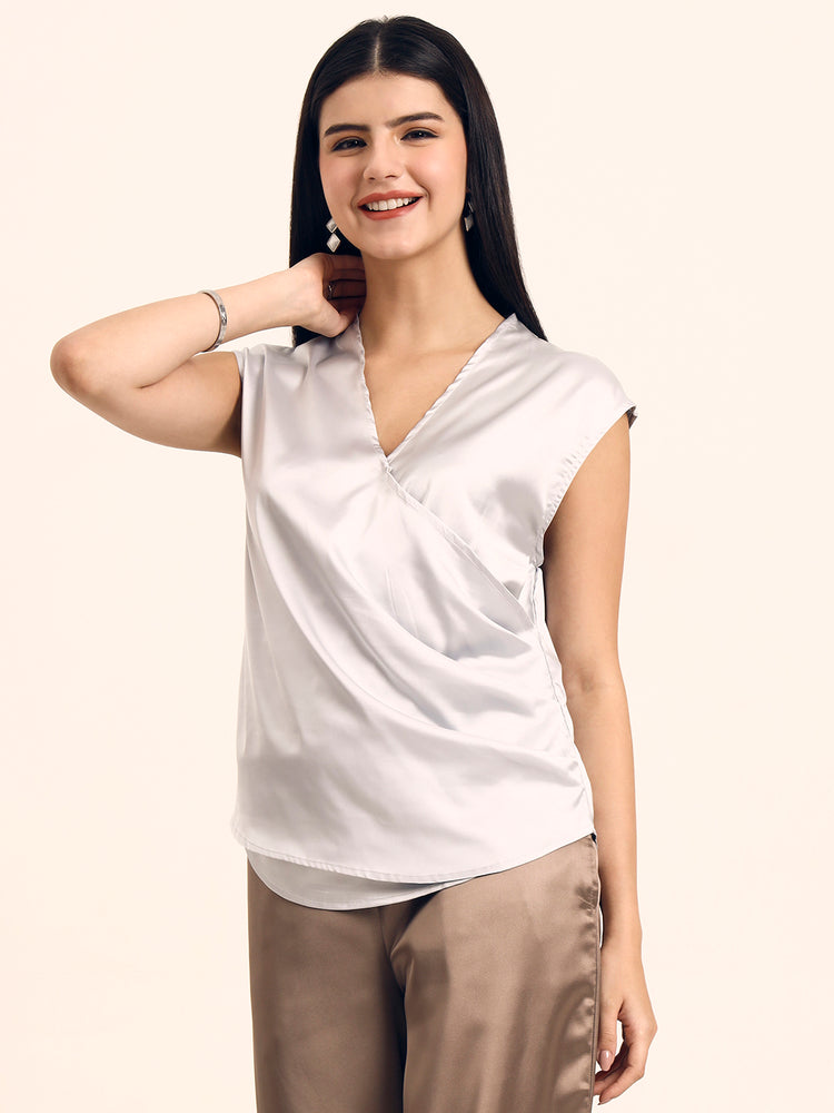 Elevate your everyday style with this elegant satin wrap top. Crafted from luxury satin fabric, it offers a luxurious sheen and a smooth, soft touch against the skin. The chic wrap-style design with a deep V-neckline adds a flattering silhouette, while the cap sleeves give it a modern and versatile appeal. Perfect for both office wear and evening outings, this top pairs effortlessly with trousers, skirts, or jeans for a sophisticated look.